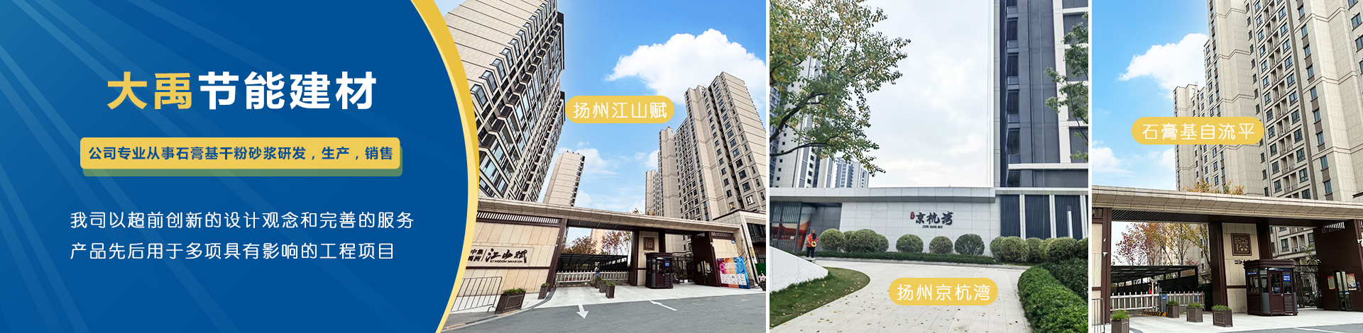 揚州市大禹節能建材科技有限公司成立于2005年9月,位于聯合國宜居城市---江蘇省揚州市,地處江都經濟開發區,與揚、鎮、泰三市接壤,交通十分便捷。公司是專業從事石膏基干粉砂漿研發,生產,銷售一體化的綜合性科技型企業,為國家標準GB/T2862-2012《抹灰石膏》的參編單位。 公司擁有國內一流的特種砂漿生產線,并配有各種先進的檢測儀器,年生產能力可達10萬噸。各崗位管理及技術人員齊備,對產品···